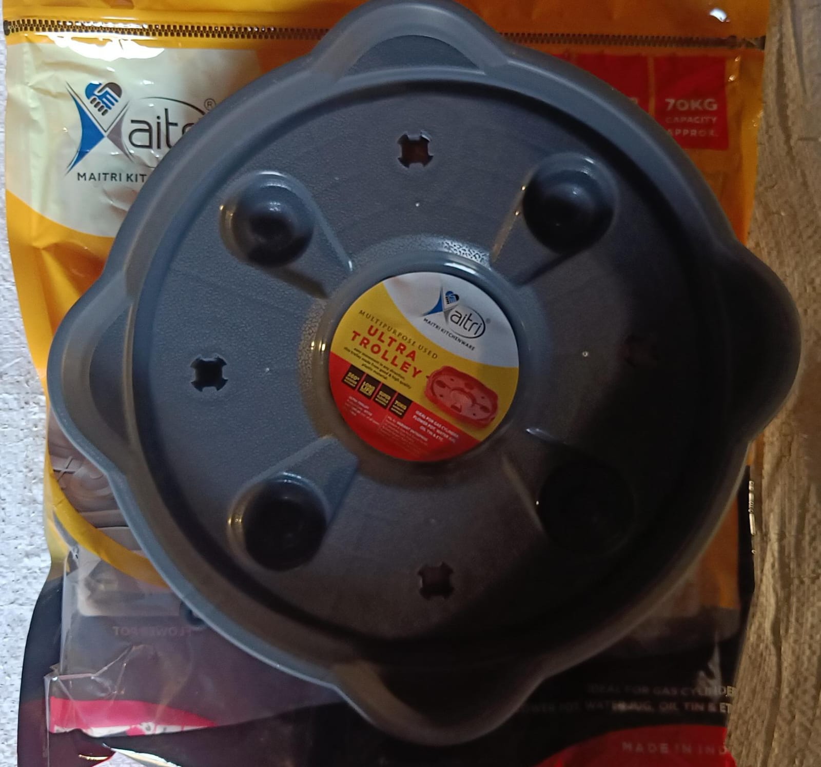 - No need to lift cylinder. LPG gas cylinder trolley- is a concept to make your LPG cylinder easily movable. It is made up of plastic making it durable and long lasting. LPG gas cylinder trolley comes with good quality wheels to make cylinder easily movable. A beautiful way to free up some extra space in your kitchen. No more scratches and rust marks on your floor heavy duty plastic good quality.